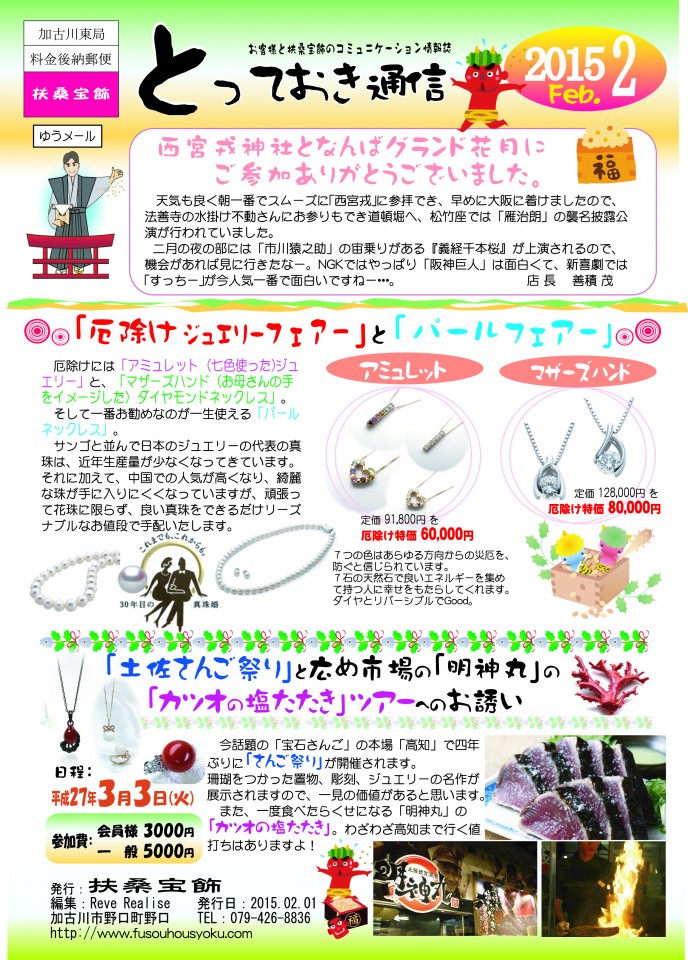 今月は「厄除けジュエリーフェアー」と「パールフェアー」のお知らせ。「カツオの塩たたきツアー」のお誘い。