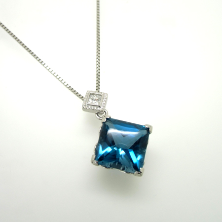 スクエアーのバフトップカットのブルートパーズに プリンセスカットのダイヤを添えました。